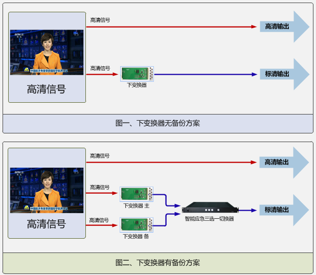 上圖中,標(biāo)清信號(hào)是通過(guò)高清信號(hào)下變換得到的,圖中只配置了一個(gè)下變換器。有人說(shuō),下變換壞了也掉電直通不就行了嗎?或者用跳線盤短接不就行了嗎?顯然不行。