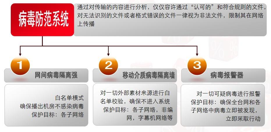 安徽天虹數(shù)碼科技有限公司為此而設(shè)計(jì)的“紅旗-9”全臺(tái)網(wǎng)病毒防范系統(tǒng),正是秉承以上制播網(wǎng)絡(luò)應(yīng)用要求研發(fā)的。該系統(tǒng)采用“白名單”確認(rèn)原理,通過(guò)板塊外病毒隔離、板塊間病毒隔離、病毒檢測(cè)定位手段,在快速、安全、完整地轉(zhuǎn)發(fā)對(duì)實(shí)時(shí)性要求極高的大數(shù)據(jù)量視音頻數(shù)據(jù)流的同時(shí),切實(shí)達(dá)到了“業(yè)務(wù)板塊內(nèi)安全”、“各個(gè)板塊間交互安全”以及“有效的病毒監(jiān)測(cè)”等安全要求。