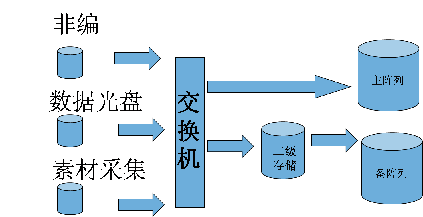 另外還配備二級(jí)存儲(chǔ)作為大量提前上載素材的存儲(chǔ)和部分重要素材的保存。二級(jí)存儲(chǔ)陣列采用RAID5數(shù)據(jù)冗余,存儲(chǔ)容量15TB.