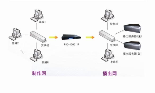 網(wǎng)絡(luò)病毒日益泛濫,防不勝防,危害嚴(yán)重。病毒來(lái)源主要是節(jié)目素材的交換,途徑主要是相關(guān)部門(mén)的設(shè)備,包括有節(jié)目上載制作部門(mén)、非編系統(tǒng)、廣告部、離線(xiàn)編劇單和審片等的網(wǎng)絡(luò)設(shè)備,總之一切與播控系統(tǒng)聯(lián)網(wǎng)的設(shè)備都有可能傳播病毒。根據(jù)網(wǎng)絡(luò)傳播的特點(diǎn)我臺(tái)采用PSC1000-IP網(wǎng)絡(luò)病毒隔離墻進(jìn)行物理隔絕、文件分析、病毒過(guò)濾(白名單原則:除非被允許,否則被禁止)等措施有效地防止了病毒傳播到播出系統(tǒng)中,杜絕了因病毒感染而引起的播出事故,病毒防護(hù)網(wǎng)絡(luò)示意圖如圖5所示。